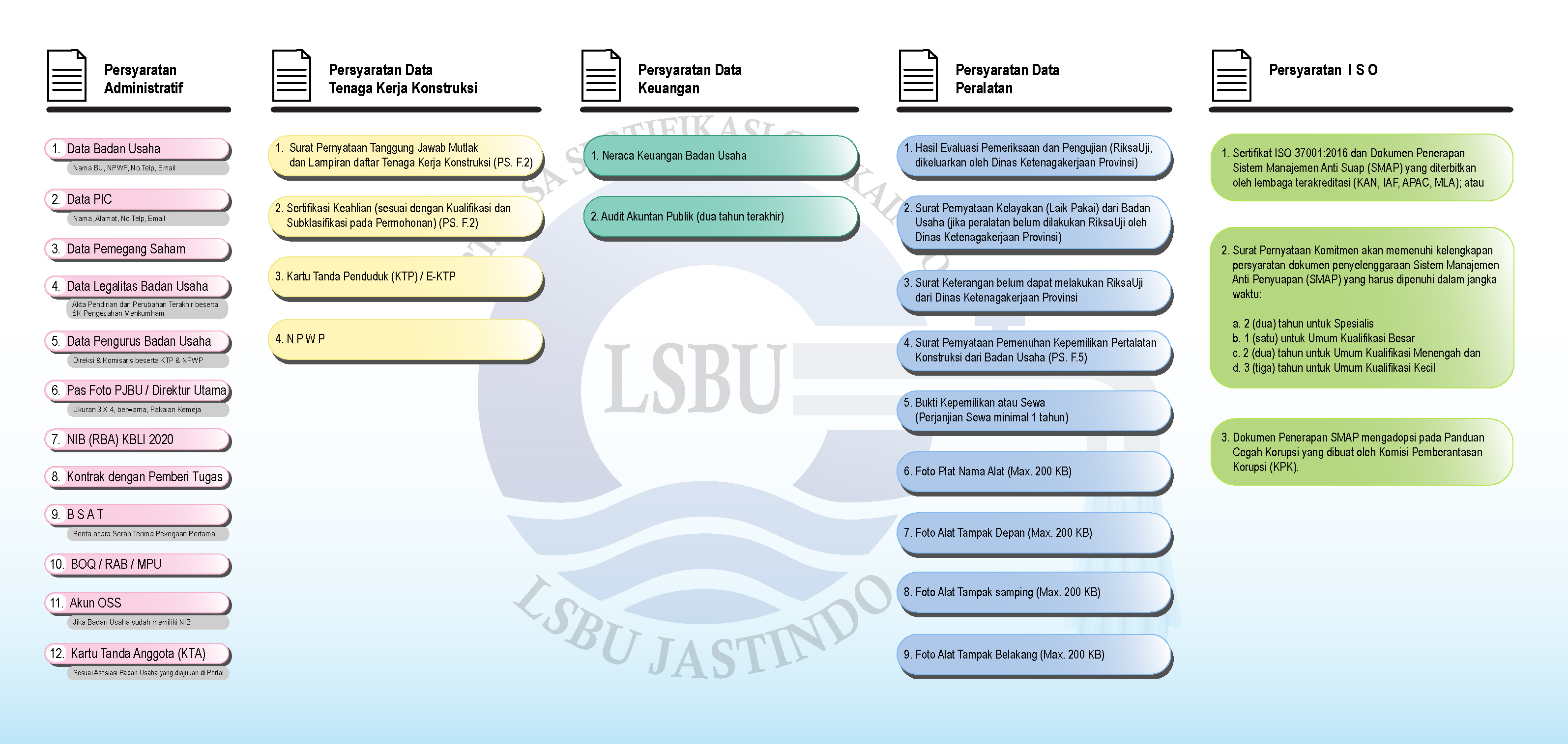 Berikut Dokumen Persyaratan Sertifikasi Badan Usaha Pekerjaan Konstruksi melalui LSBU PT. Jasa Sertifikasi Gapkaindo (JASTINDO) seperti digambarkan di atas.
